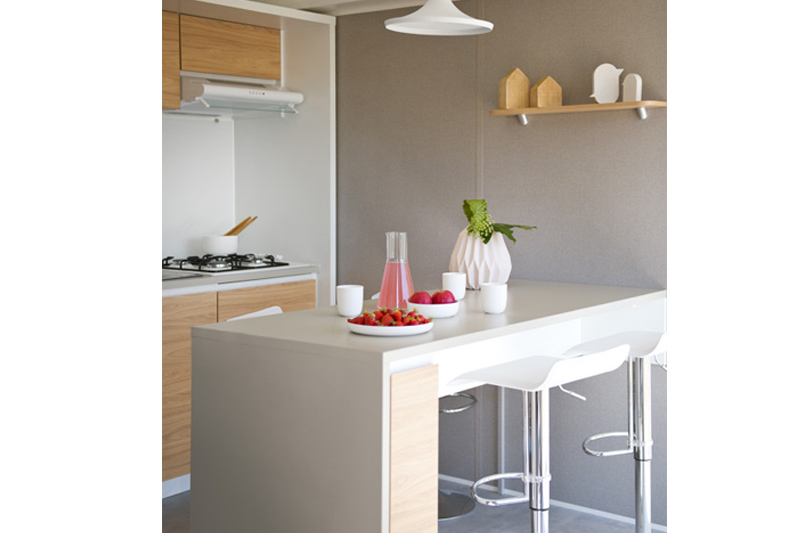 Nombreux rangements : tiroirs, casseroliers, meubles bas et hauts, rack à verres